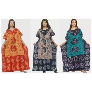 “Cotton Batik Caftan Red Yellow, Green Beige Assorted Print Long Kaftan Set of 3” has been added to your cart.